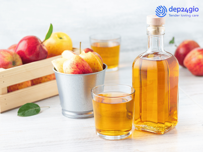 Giấm táo có tính axit nhẹ, giúp cân bằng độ pH của da đầu, loại bỏ dầu thừa và làm sạch tóc một cách tự nhiên. Sau khi gội đầu, bạn có thể pha loãng giấm táo với nước (tỉ lệ 1:2) rồi thoa lên tóc như một loại dầu xả. Để yên trong vài phút trước khi xả sạch với nước. Giấm táo sẽ giúp tóc bạn sáng bóng và mềm mượt hơn ngay từ lần sử dụng đầu tiên.