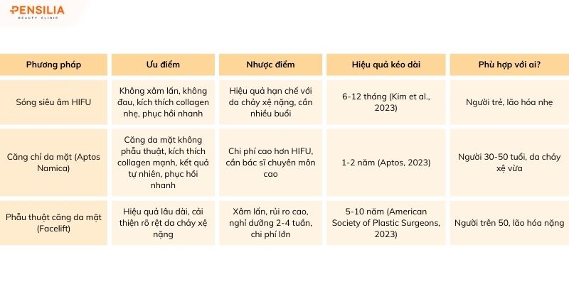 HIFU: Tốt cho lão hóa nhẹ, phòng ngừa, nhưng không hiệu quả với chống chảy xệ nghiêm trọng.