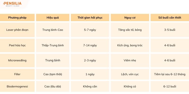 Laser và peel hóa học thường gây đau, cần thời gian nghỉ dưỡng, và có nguy cơ biến chứng. Filler mang lại hiệu quả tạm thời nhưng không khắc phục tổn thương sâu. Kết hợp nhiều phương pháp có thể tăng hiệu quả nhưng làm tăng chi phí và kéo dài thời gian điều trị.