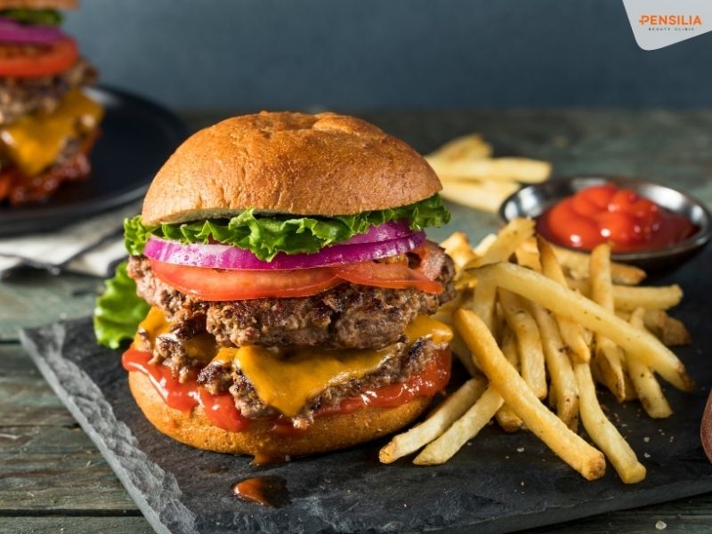 Đồ ăn nhanh luôn nằm trong danh sách đen của các chuyên gia dinh dưỡng khi nói đến sức khỏe, đặc biệt là làn da. Những món ăn này chứa hàm lượng chất béo bão hòa và dầu mỡ cao, dễ gây viêm trong cơ thể. Viêm là một trong những nguyên nhân chính gây tắc nghẽn lỗ chân lông và hình thành mụn.