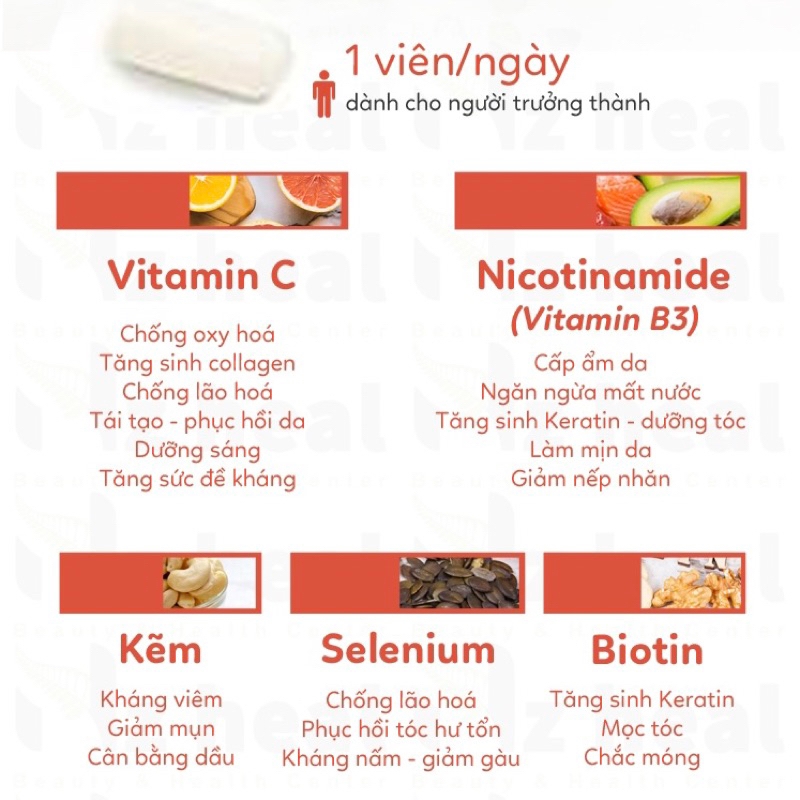 Viên uống HSN Hair Skin & Nails chứa Vitamin C, Kẽm, Biotin và Selenium, các thành phần thiết yếu hỗ trợ quá trình hình thành và sửa chữa collagen, tái tạo da, tóc và móng.